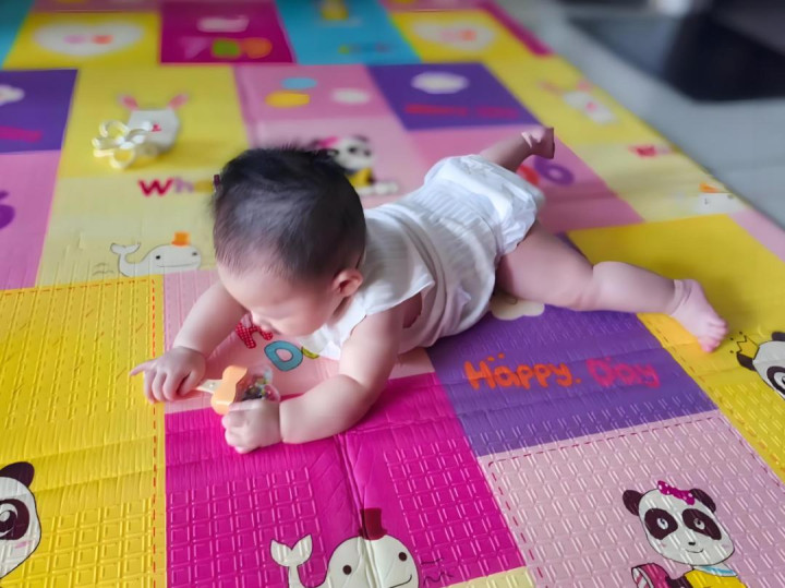 我家贝儿七个月时,我就在客厅铺了爬爬垫,把玩具扔得远一点,让她自己爬着去够。